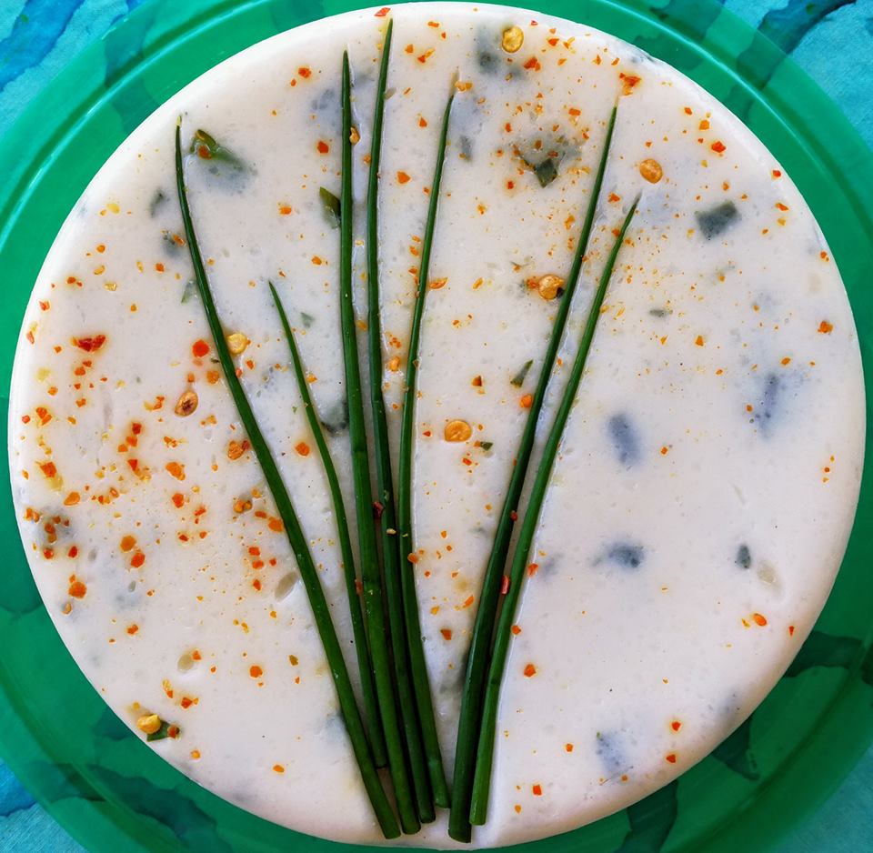 In addition to pulling weeds, I also collected chives and garlic chives from my garden last night, which are key ingredients to one of the cheeses I made today. The recipe also contains white wine, which adds depth to the acidity profile of the cheese. I imagine that this cheese would go brilliantly with some crusty French baguette and a glass of wine (or a cup of tea, which I personally prefer).